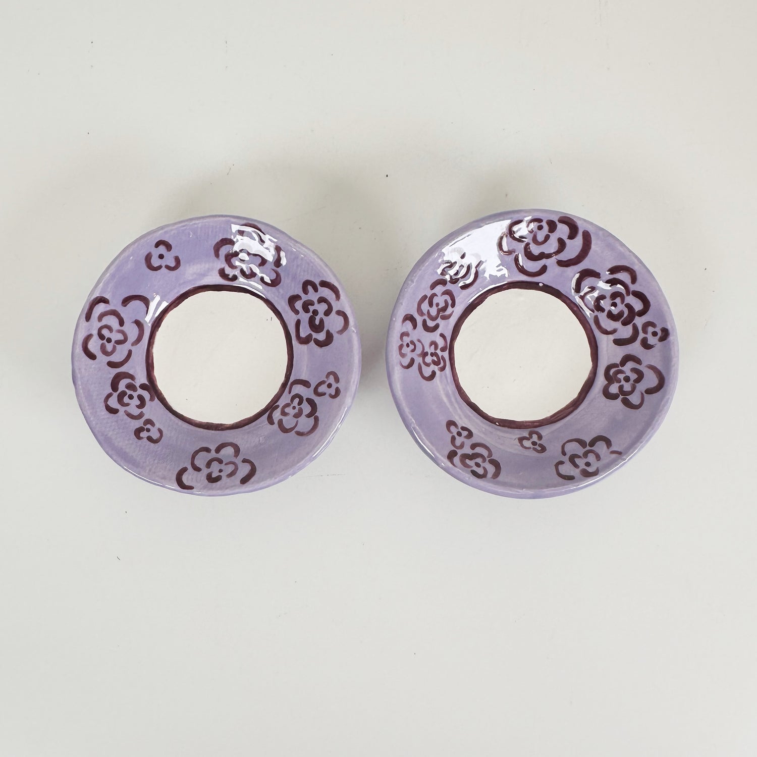 Handpainted by Jessica Walker, these tiny, ceramic dishes feature a purple rose pattern!