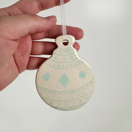 Hand Painted Flat Sea Foam Green Patterned Bauble Ceramic Ornament | Terra Clay