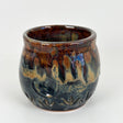 The artist behind Bunnyfoot Pottery, Kendall Carpenter, often infuses her frustration with politics into her artwork! This cheeky little mug is hand thrown and decorated with a rich brown, tan, and deep blue glazes. It also features the phrase "First Defeat Tyrants" stamped into the bottom.