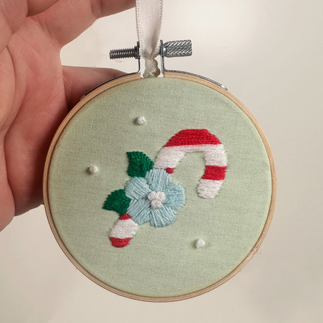 Embroidery Hoop Ornament with Embroidered Candy Cane- Green | Dangit Design