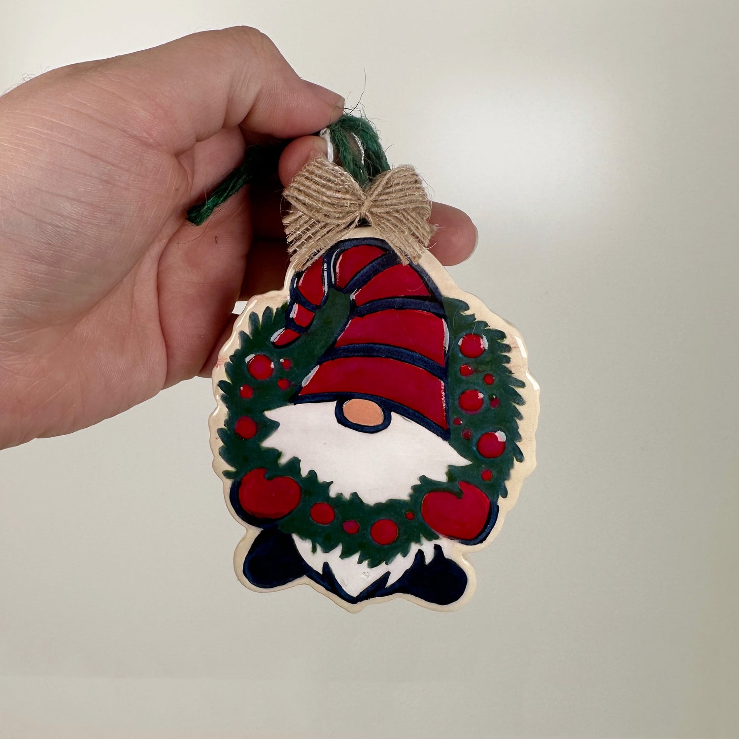 Gnome with Wreath Ceramic Ornament | Sherry Strickland is backordered and will ship as soon as it is back in stock.