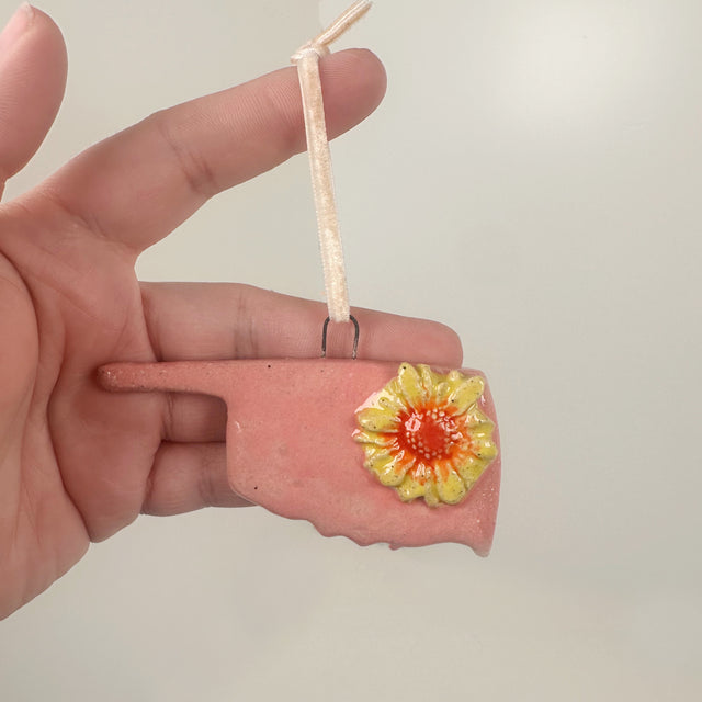 Warm Pink Oklahoma Shaped Ornament with Flower- A | Lazy Clay Lady
