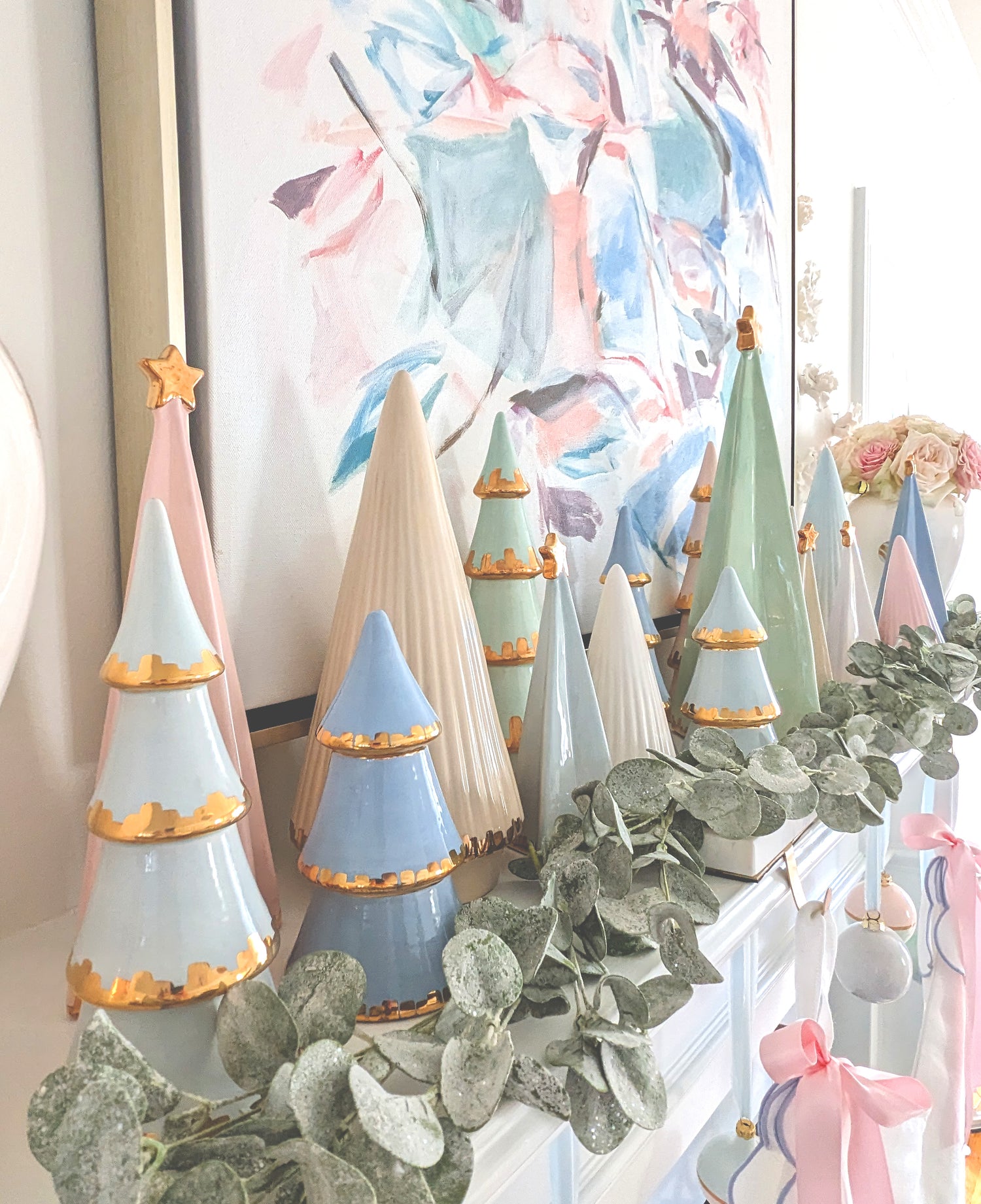 The gorgeous colors and handcrafted charm of these trees make an artful and unique addition to your home for the holidays. Mix and match them to create a personalized and stunning vignette on your holiday table or mantle or sprinkle them about for merry and bright touches throughout your home. Each tree is glazed by hand and adorned with a freehand 22K gold brushstroke trim and a shining star on top.