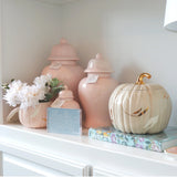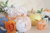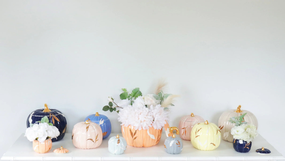 The falling leaves of autumn are layered onto these charming pumpkin -shaped jars during both the glazing and gold application process, and the result is an exquisite and unique take on a functional and festive piece. These jars can be used as a vase to showcase harvest blooms, hold yummy treats, or simply add a unique and colorful seasonal touch around the home.