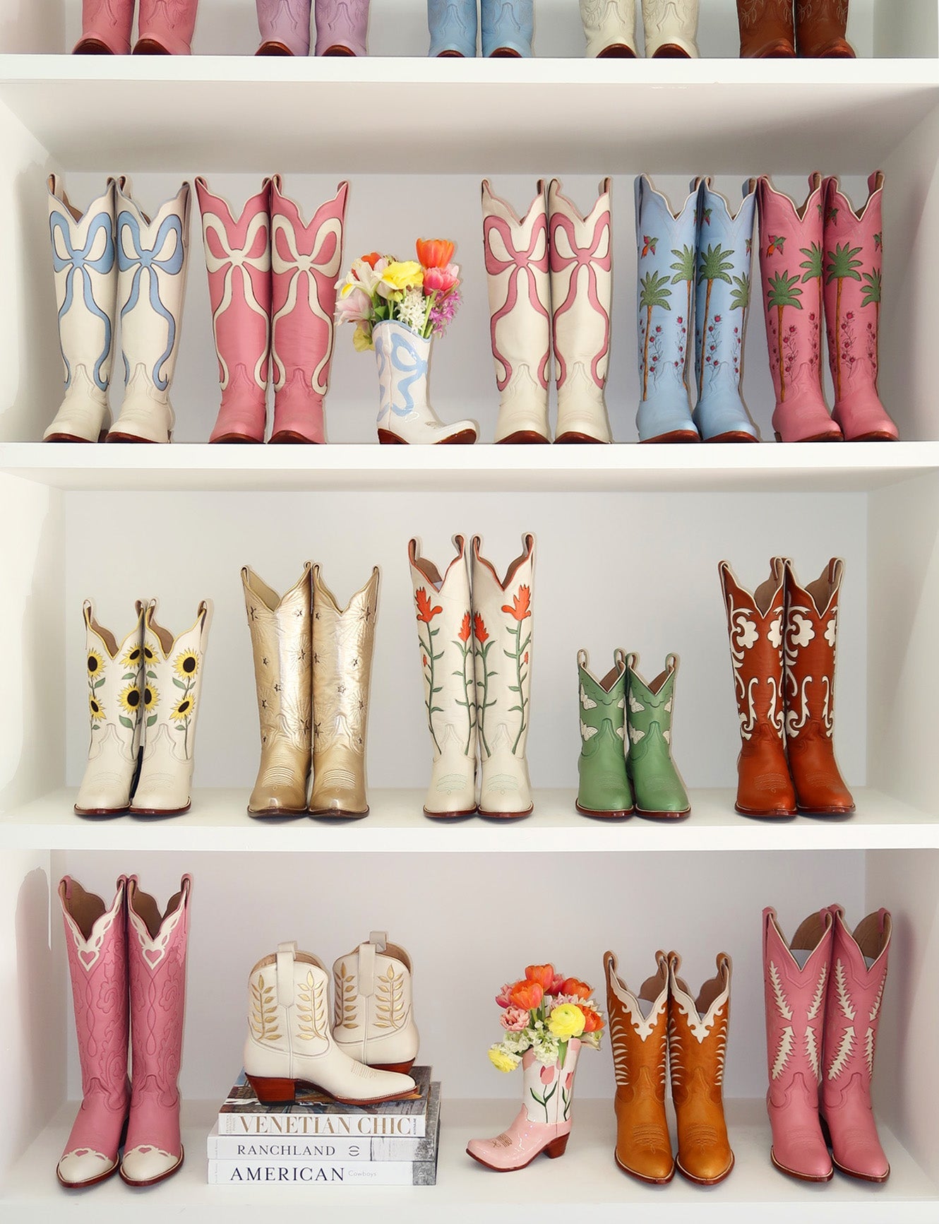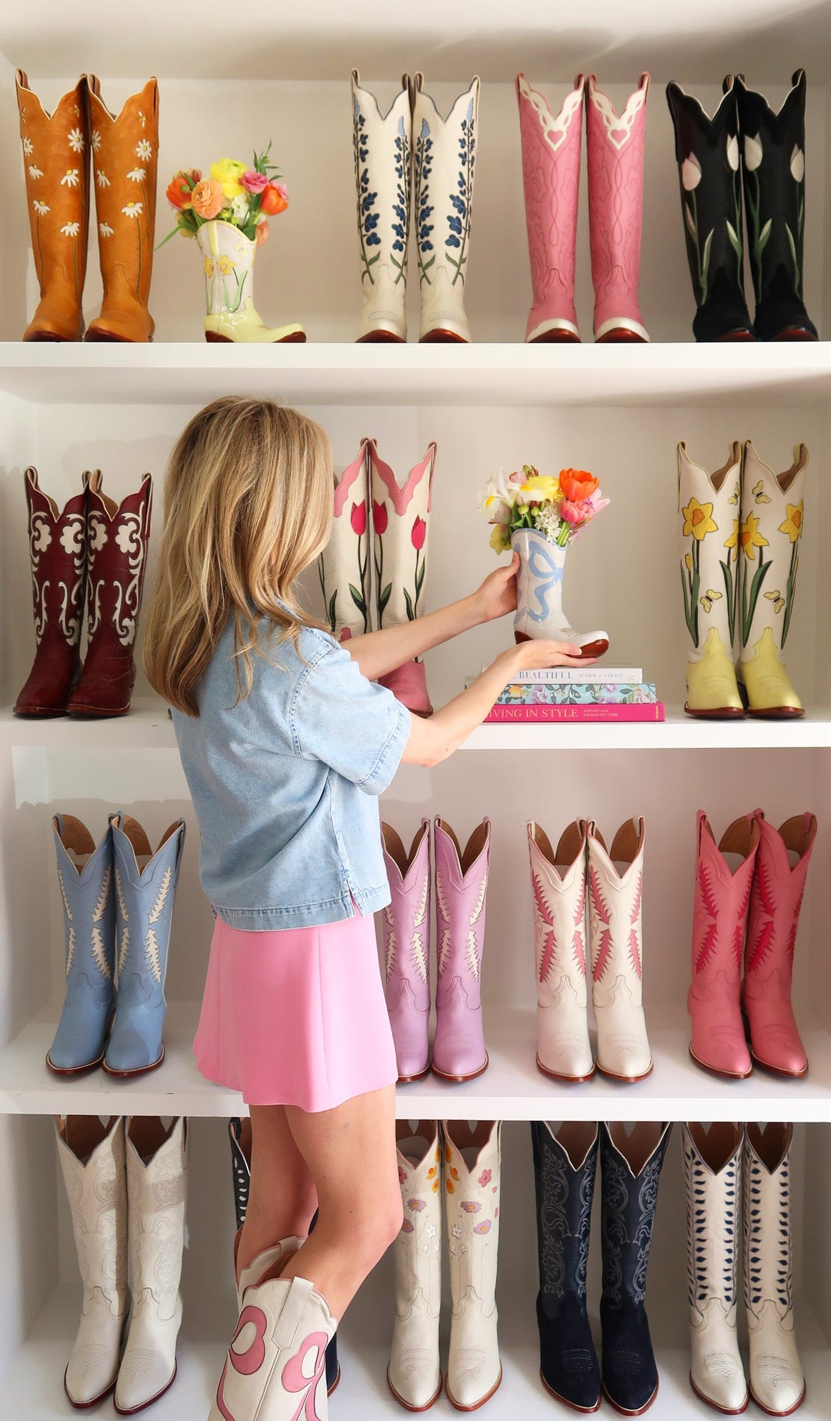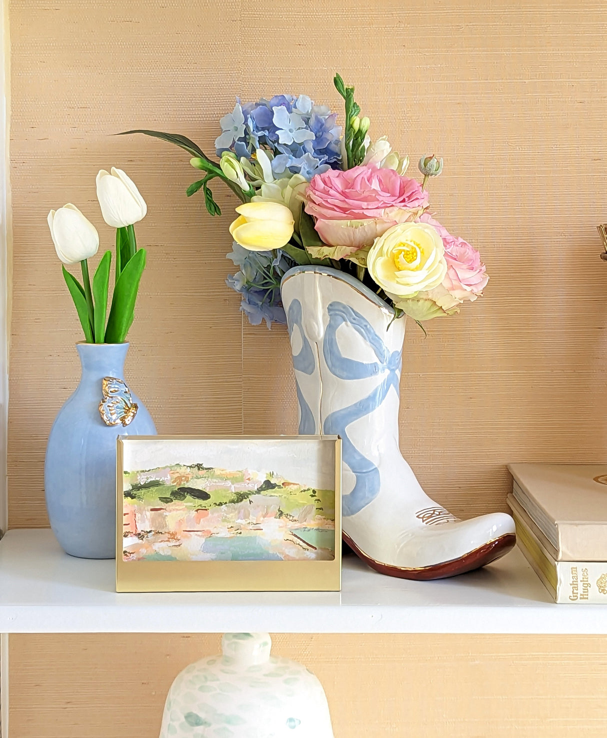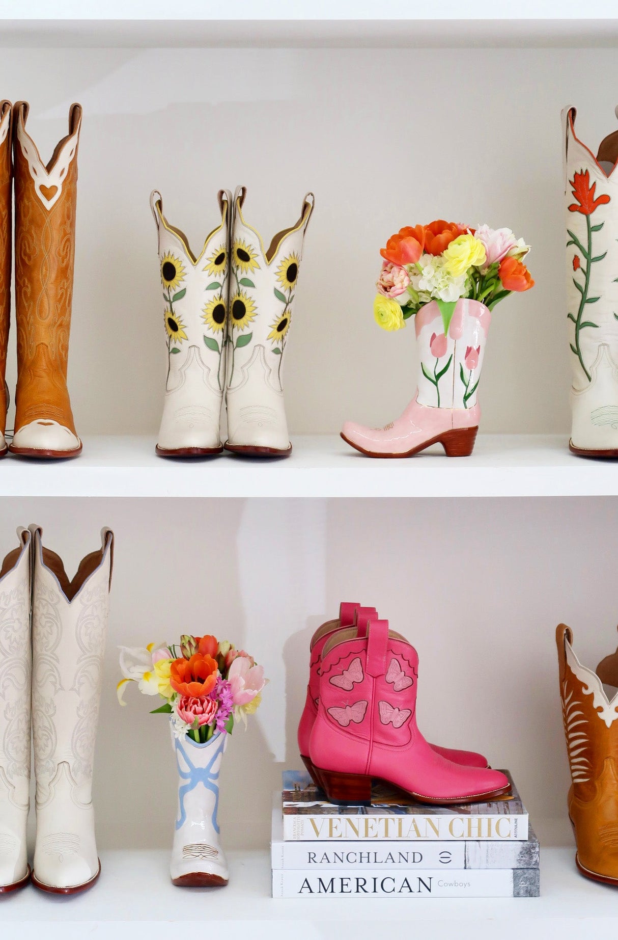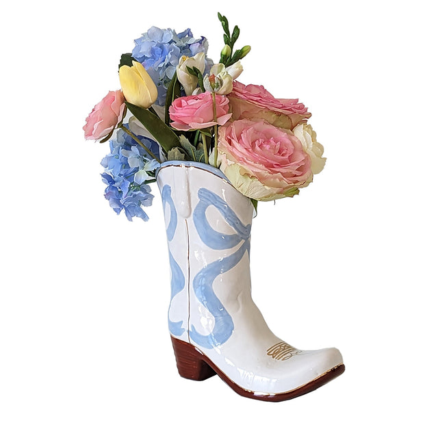 This limited-edition collaborative collection is inspired by the heirloom cowgirl boots of Petite Paloma. Petite Paloma designs each boot with inspiration taken from southern style and Texas wildflowers. This design features an adorable bow for timeless and classic feminine flair! These boot vases are a perfect solution as a centerpiece on an event table, that empty spot on your bookshelf, or as a gift for that special someone in your life. Each boot is skillfully hand-painted by a Ruby Clay Co. artist and finished with hand-painted 22K gold accents for a waterproof finish.
