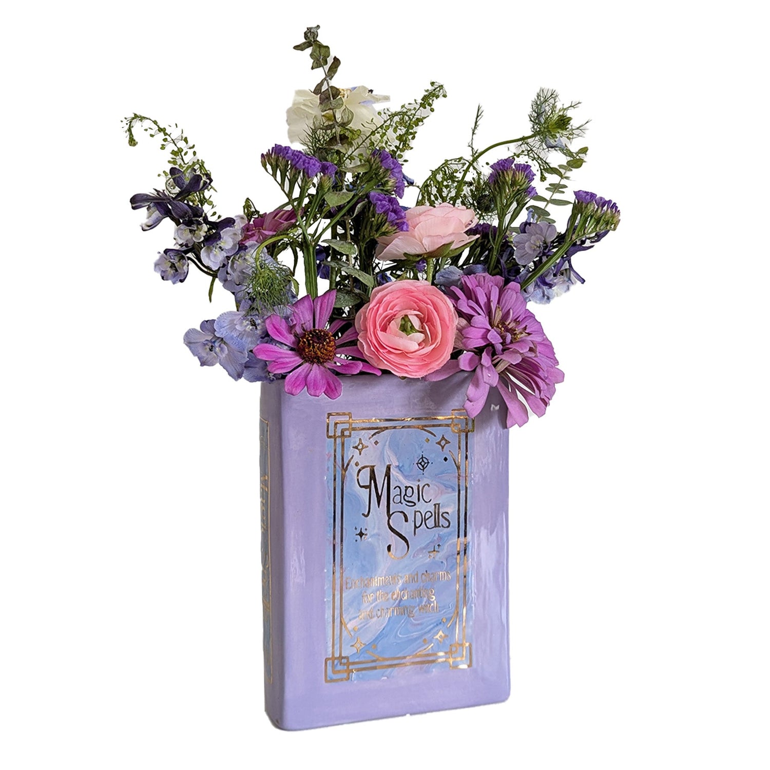 This unique vase is inspired by the mystical and witchy vibes of the spooky season. Reminiscent of the hocus pocus and potions classes of our favorite seasonal tales, we feel so much joy creating these unique works of art for your home. The subtitle reads; "Enchantments and charms for the enchanting and charming witch."