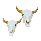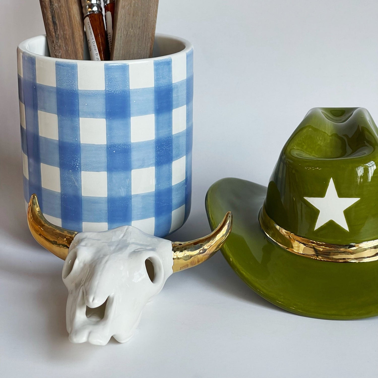 Add a touch of contemporary, western charm to your space with these stunning ceramic cow skull decor pieces. Featuring 22k gold horns, these unique accents will instantly elevate the style of any room. Whether displayed on a shelf, mounted on a wall, or used as a centerpiece, these eye-catching pieces are sure to make a statement. These pieces are hand-poured in Oklahoma and hand-glazed by a Ruby Clay artist before being fired for a beautiful and durable finish. This style features hand-painted 22K gold horns.