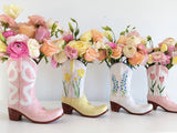 This limited-edition collaborative collection is inspired by the heirloom cowgirl boots of Petite Paloma. Petite Paloma designs each boot with inspiration taken from southern style and Texas wildflowers. This design features delicate bluebonnets- so unique and beautiful! These boot vases are a perfect solution as a centerpiece on an event table, that empty spot on your bookshelf, or as a gift for that special someone in your life. Each boot is skillfully hand-painted by a Ruby Clay Co. artist and finished with hand-painted 22K gold accents for a waterproof finish.