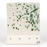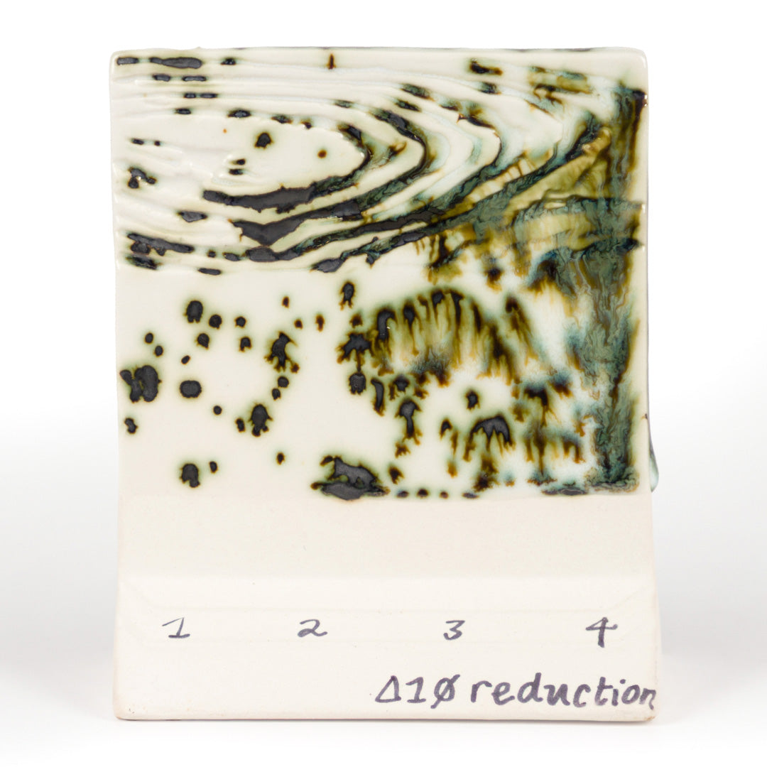 Cone 6 oxidation (First Image):Green Jasper is a glossy, transparent white glaze that breaks over texture. Contains metallic green and blue crystals. Base color is stable, crystals can create movement.