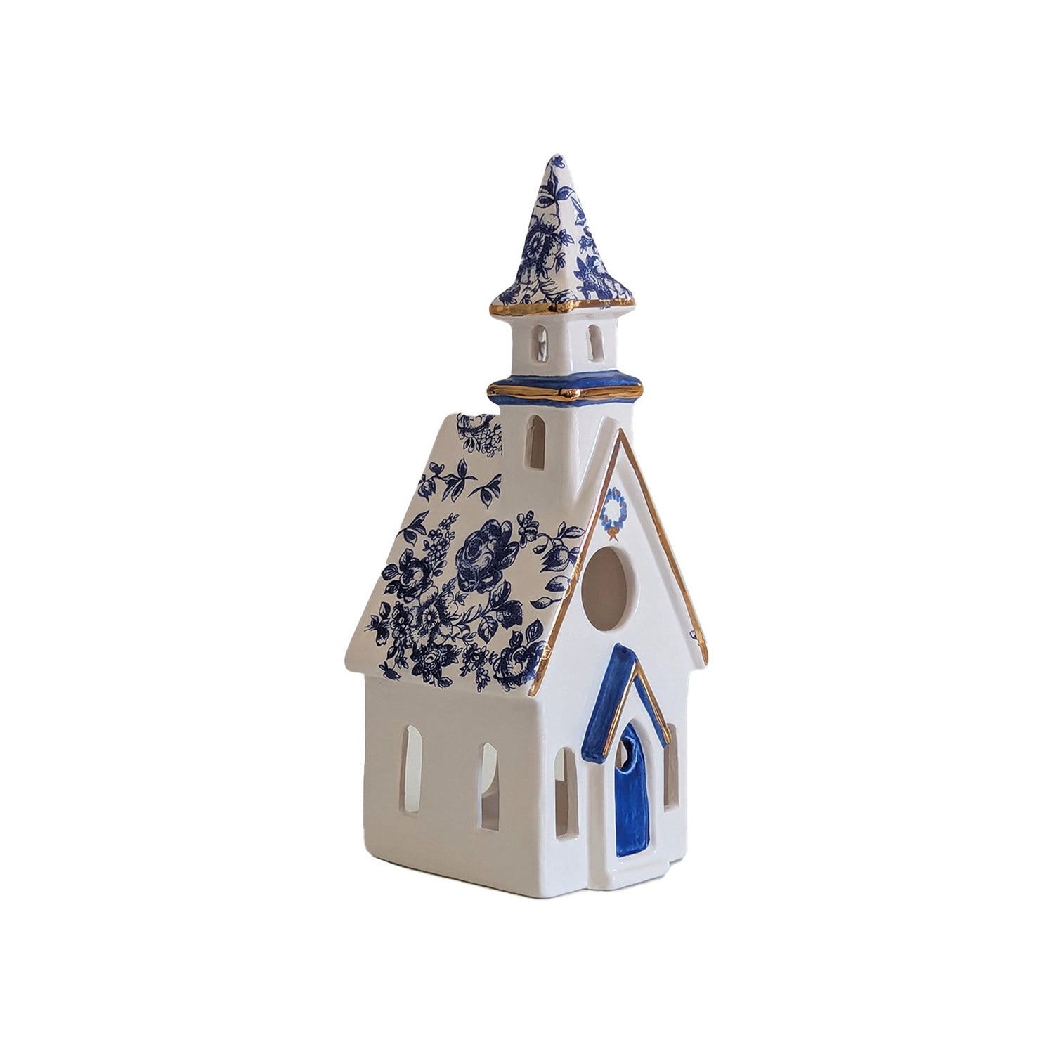 This beautiful hand-painted village is sure to become a treasured holiday heirloom. The three piece set includes two cottages and a chapel adorned with festive lights and wreaths in hand-applied 22K gold. Each piece holds a tea light or fairy lights inside which allows warm twinkly light to shine out through the windows to create a dreamy winter wonderland.