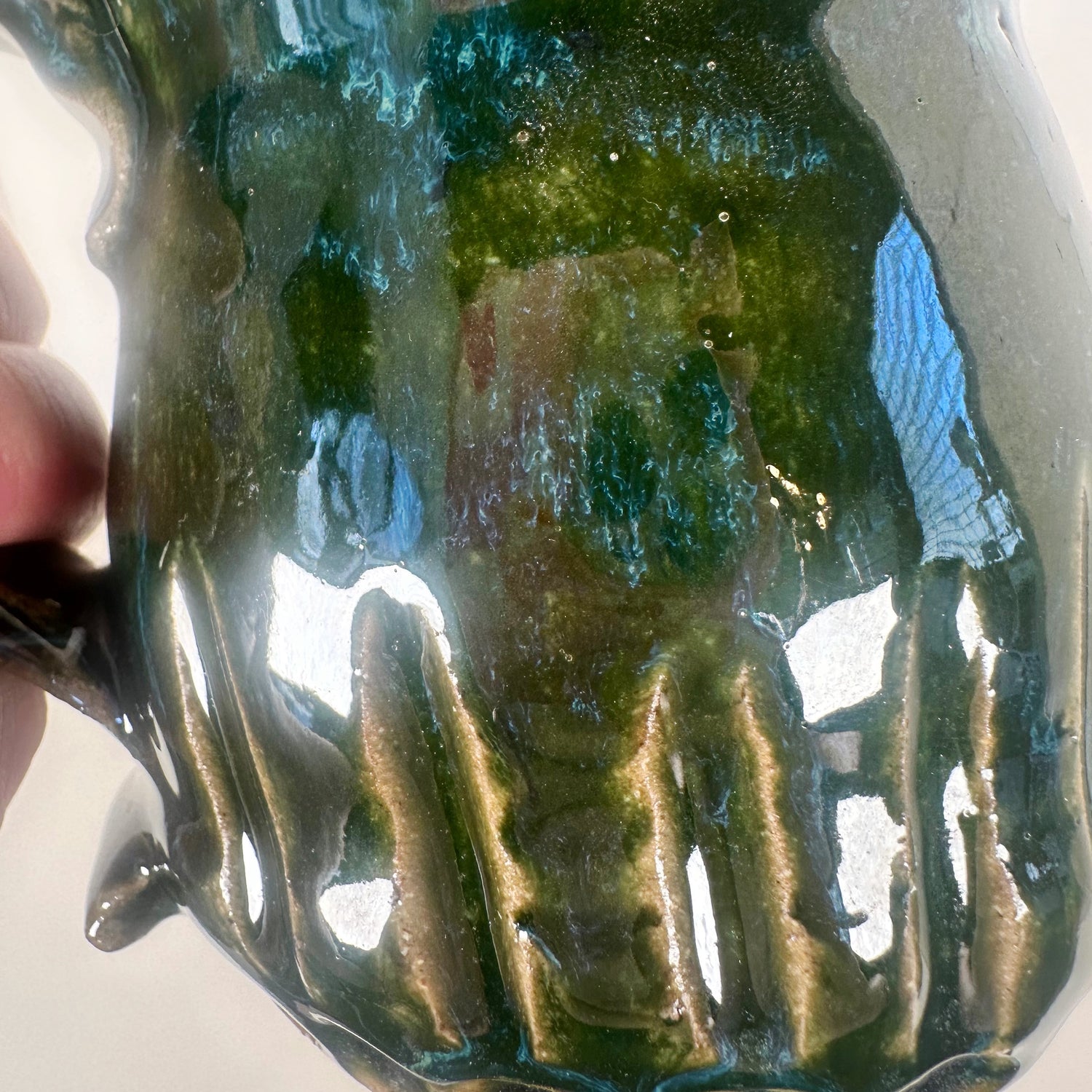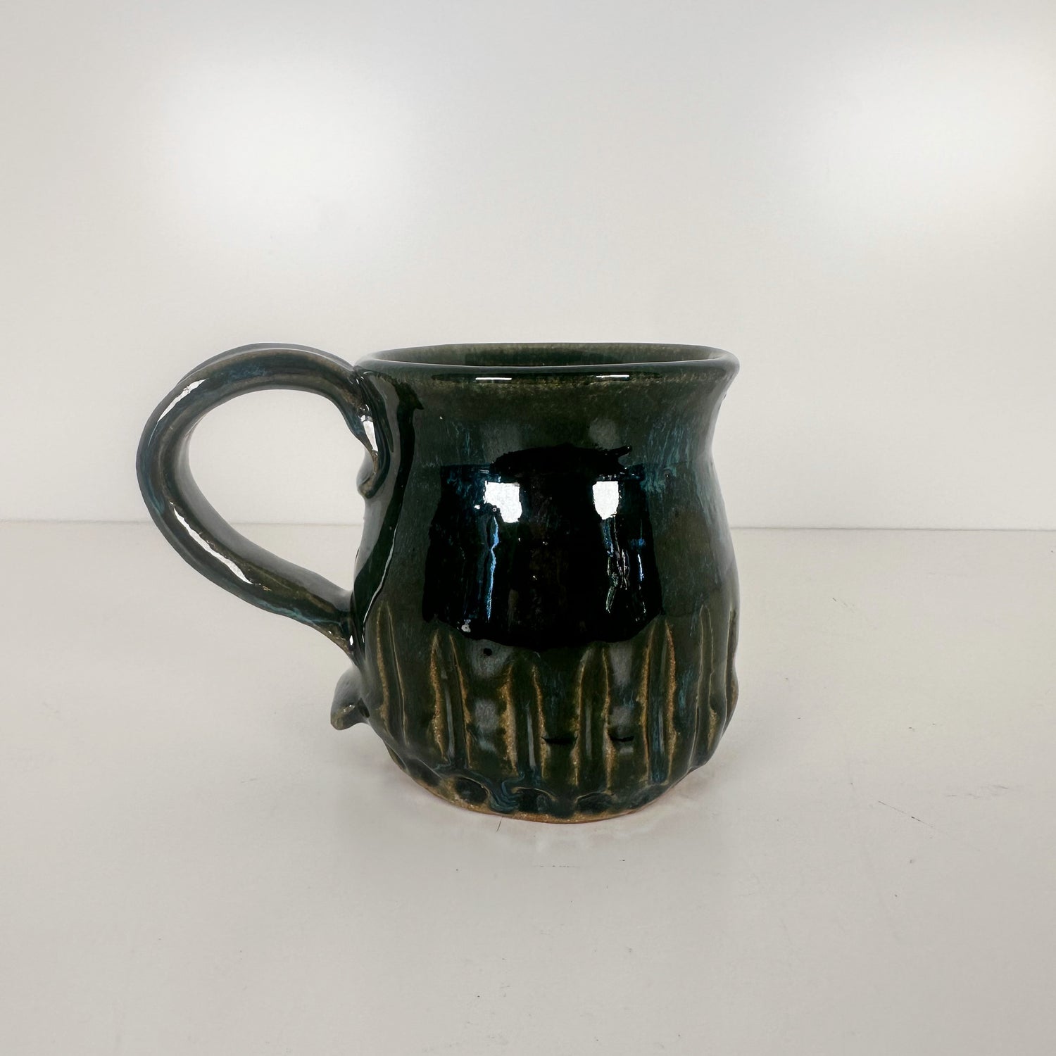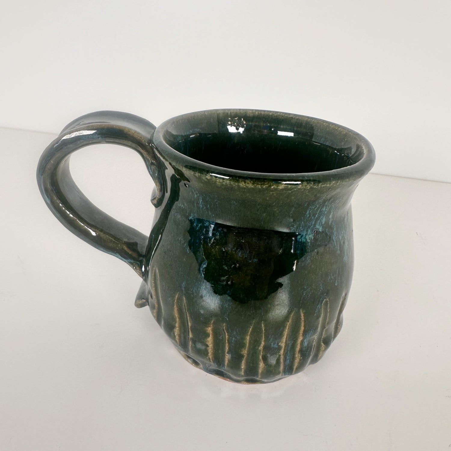 Featuring a glossy, intense green glaze, this mug was hand thrown and carved by artist Kendall Carpenter of Bunnyfoot Pottery! The perfect gift for lovers of deep earthy green, or any mug lover!