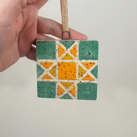 Teal & Yellow Ceramic Quilt Ornament | Perrier Pottery