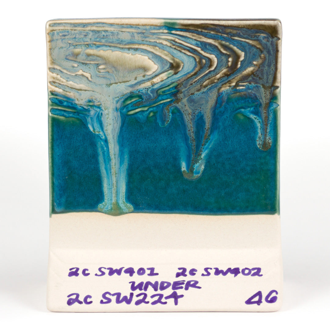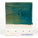Cone 10 reduction (Second Image): Color shifts to blue with white float. Remains stable.
