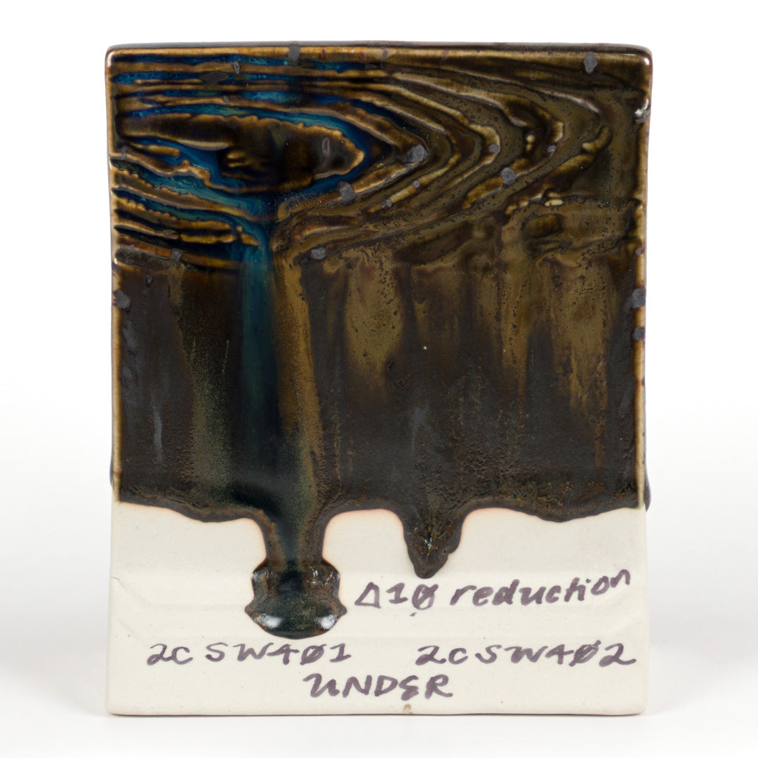 The choice of clay body, thickness of glaze application, firing process and temperature will affect the fired results. Always test in your kiln, on your clay body