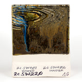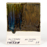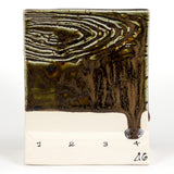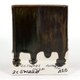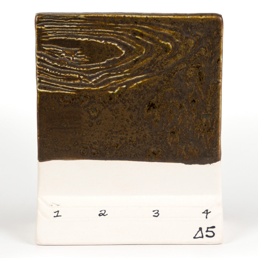Cone 6 oxidation (First Image): Black Timber is a satin, opaque, mottled brown glaze that breaks over texture. Contains glossy brown crystals. Base color is stable, crystals can create movement.