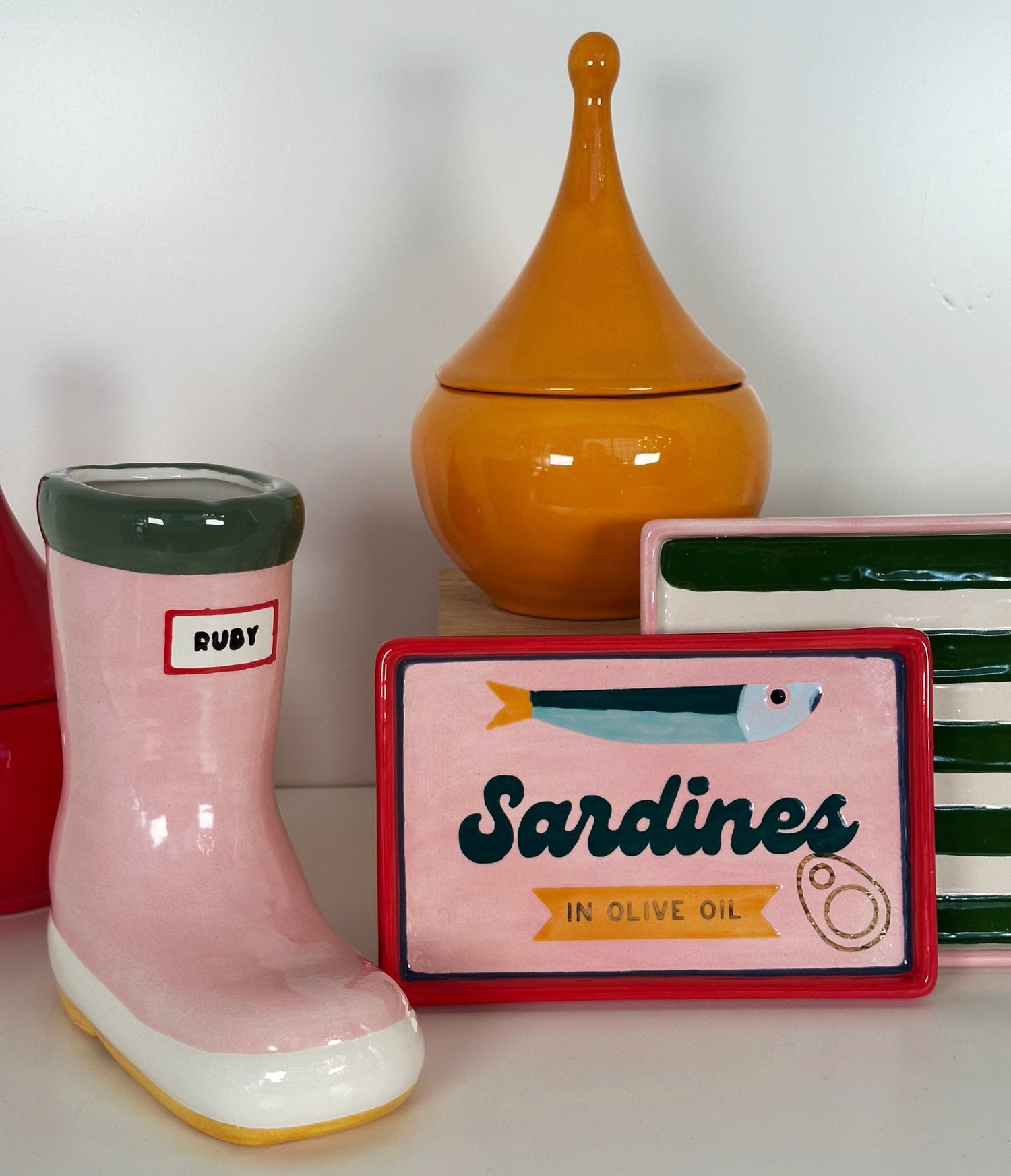 Sardines and canned fish are all the rage and we couldn't help but jump on the trend! Featuring 22k gold accents, this handpainted tray is perfect for precious tinies like necklaces and earrings. Pair it with a low profile striped set for a darling set!