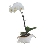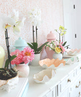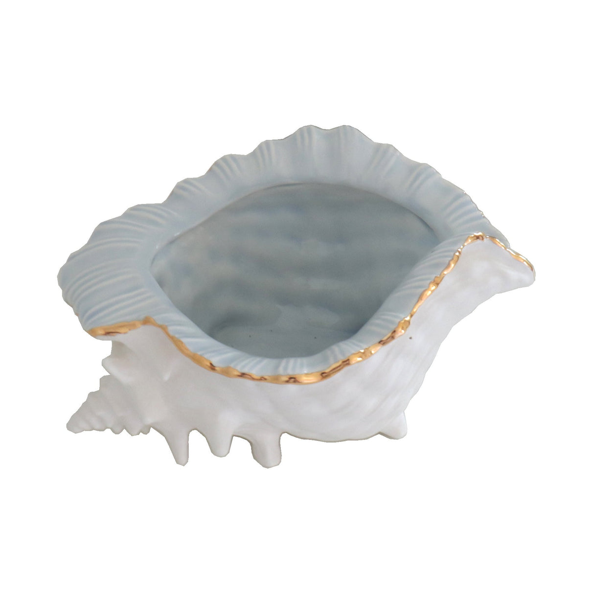 The breezy, coastal colors and handcrafted charm of these faux conch shells make an artful and unique addition to your home for the summer season, or all year round. These ceramic shells with a silky matte ivory exterior, colorfully glazed interior, and 22K gold rim work as a decorative bowl, vase for a small plant, or accent on a console table, coffee table, accent table, or island. The small shell also serves as a beautiful catch all or jewelry display. Each shell is crafted and glazed by hand in Oklahoma, and adorned with a 22K gold trim.