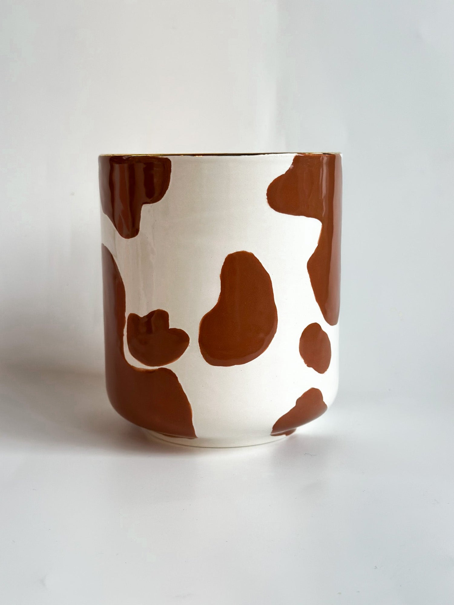 Cow print is on trend, partner! Join the movement with our cow print vases. Available in three different colors, these vases are hand-glazed by a Ruby Clay artist before being fired for a beautiful and durable finish.