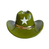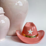 Add a touch of country charm to your space with this colorful ceramic cowboy hat decor. Whether you're a fan of the Wild West or simply looking to add a pop of color to your home, this ceramic cowboy hat is the perfect choice. Place it on a shelf, mantel, or use it as a centerpiece to create a fun and stylish focal point in any room. Our hats are hand-poured in Oklahoma and hand-glazed by a Ruby Clay artist before being fired for a beautiful and durable finish. This style features a hand-painted 22K gold band.