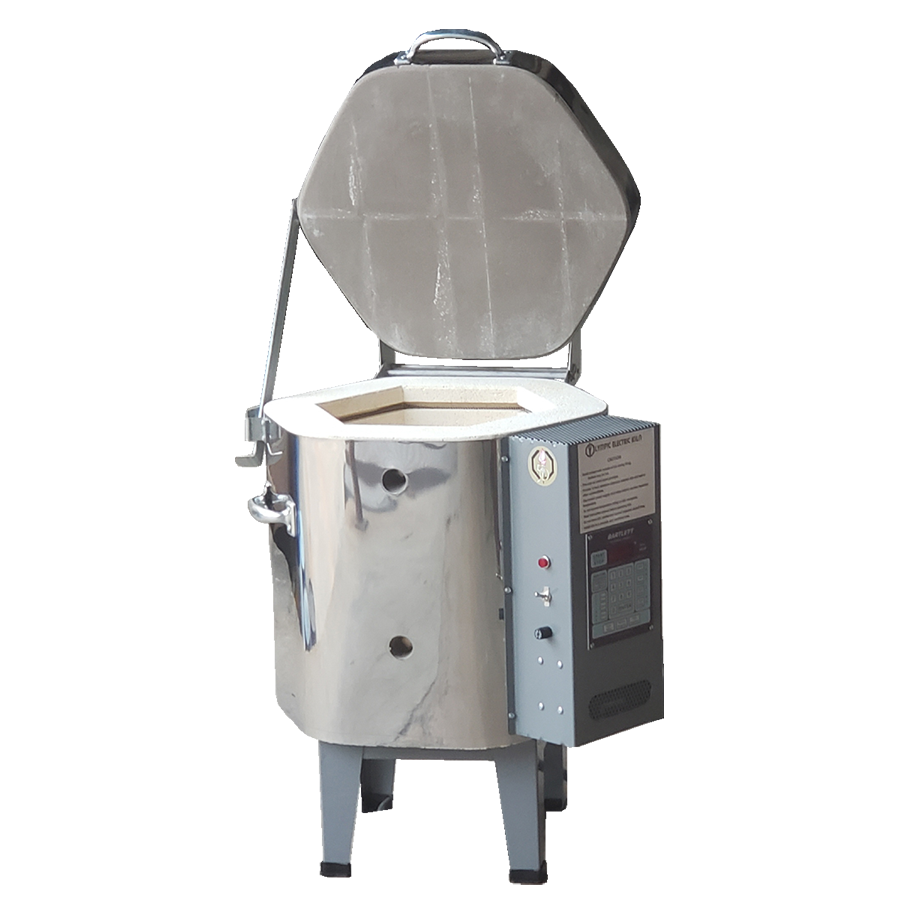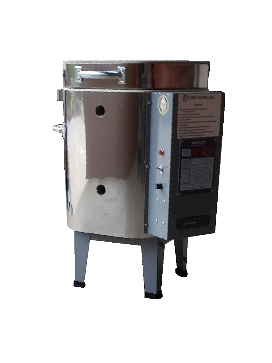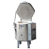 This electric model comes equipped with a pilot light, attached stand, stainless steel jacket, and the Bartlett KilnStar digital controller.