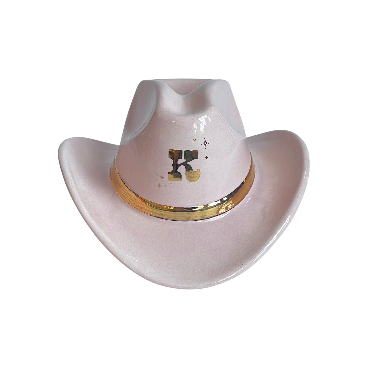 Add a touch of country charm to your space with this colorful ceramic cowboy hat decor. Whether you're a fan of the Wild West or simply looking to add a pop of color to your home, this ceramic cowboy hat is the perfect choice! Place it on a shelf, mantel, or use it as a centerpiece to create a fun and stylish focal point in any room. Our hats are hand-poured in Oklahoma and hand-glazed by a Ruby Clay artist before being fired for a beautiful and durable finish. This style features a hand-painted 22K gold band & confetti monogram.