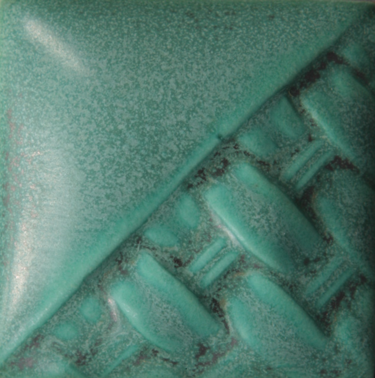 Cone 6, Photo 1:Satin Patina is a rich tonal matte green patina glaze. The variation of the glaze is dependent on application. The thicker the application the more opaque and homogenous the color will be, and thinner application will allow more of the clay body to show through the glaze. Satin Patina is a stable glaze.