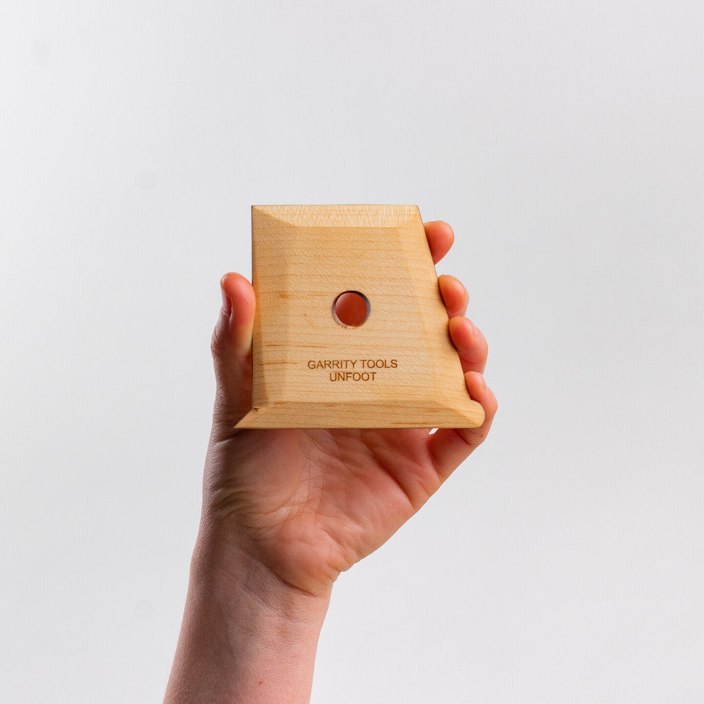Unfoot provides a simple way to give your vessel a bit of a lift. With a point sticking out from one corner and a curve from the other, you can undercut your clay while maintaining the shape of your walls. This tool will save you tons of time that you might spend trimming later.
