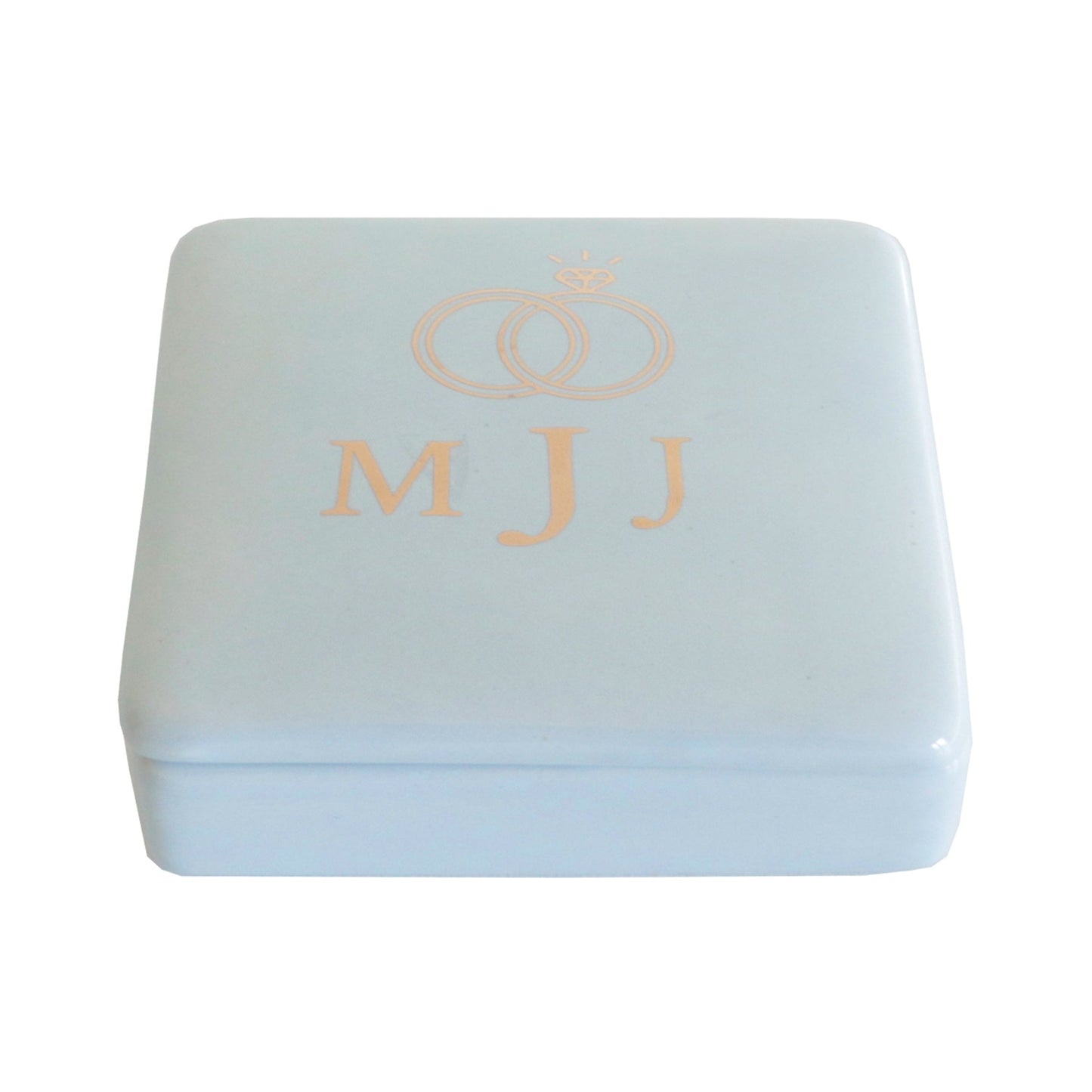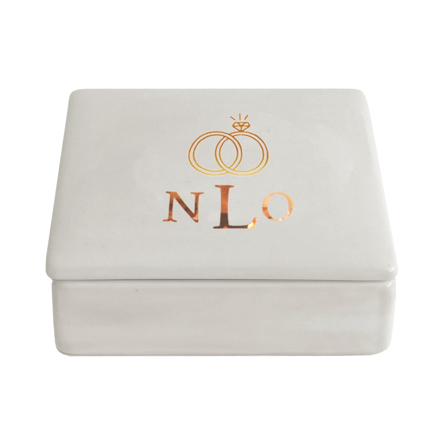 Celebrate the exciting and precious time of a wedding with this meaningful keepsake box which is sure to be treasured for a lifetime. Our hand-painted ceramic boxes are personalized in 22K gold with the new bride's or new couple's initials and a charming wedding ring illustration. Beautiful as a jewelry box or catch-all, each box adds a pop of color and personalized elegance to any space.